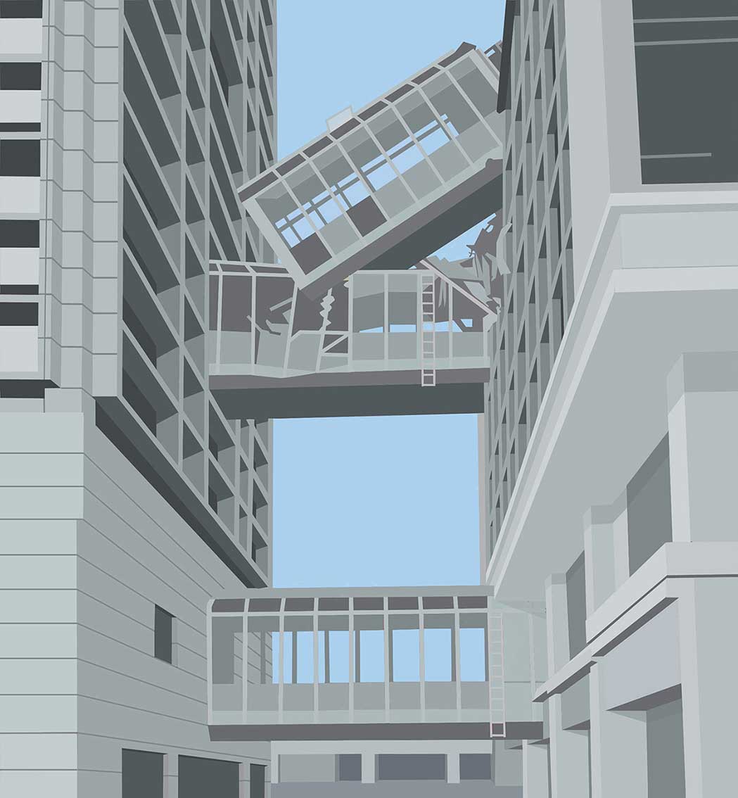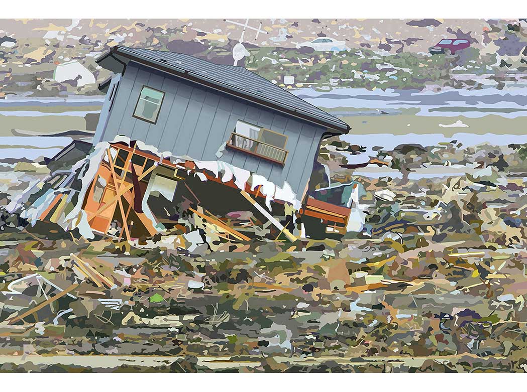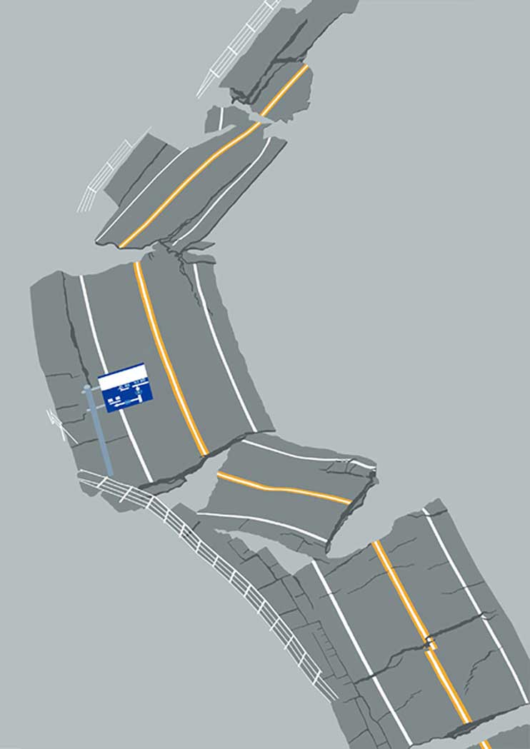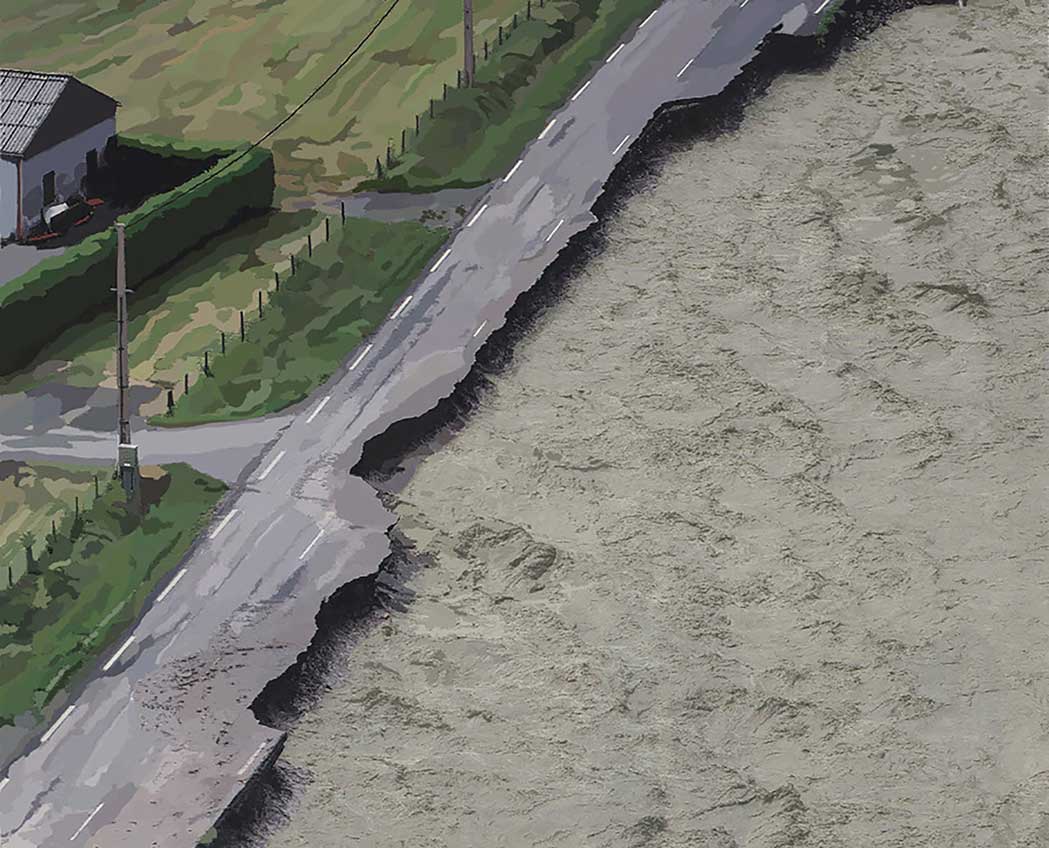 A series of digital images reworking media photographs demonstrating the enormous power of natural forces to distort and destroy man-made infrastructure designed to ‘conquer’ nature.