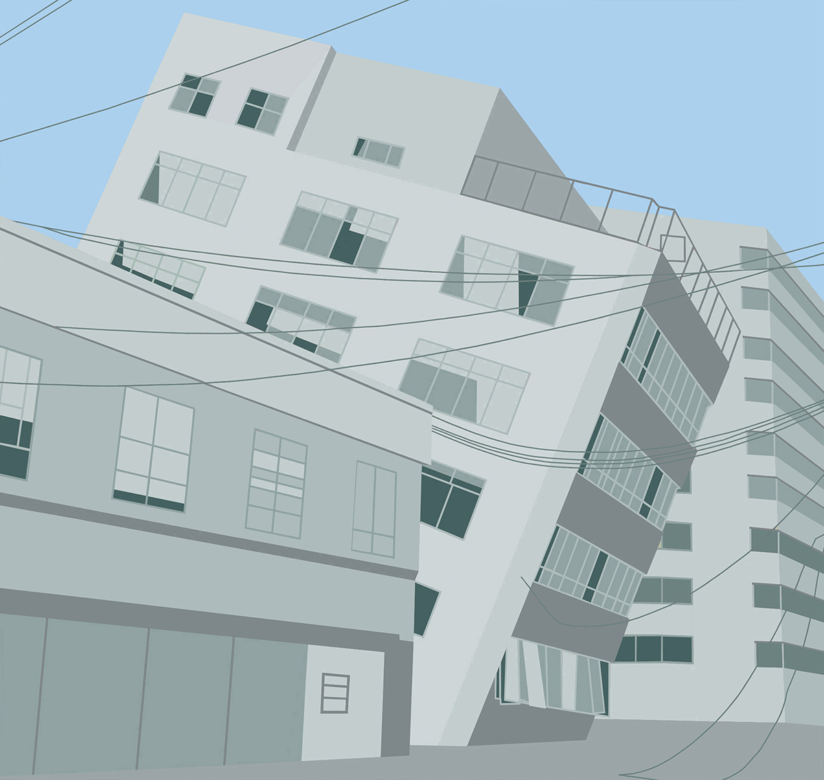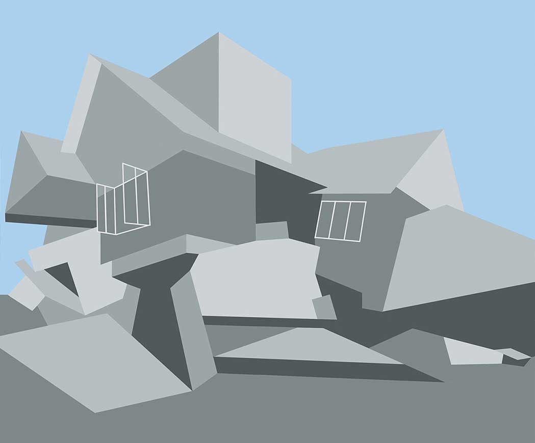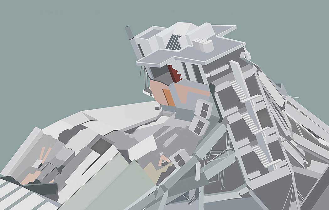 A series of digital images reworking media photographs demonstrating the enormous power of natural forces to distort and destroy man-made infrastructure designed to ‘conquer’ nature.